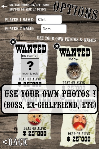 TIP: don't forget you can use your OWN PHOTOS (friends, boss, pets, neighbour, anything that's fun) to replace the built-in targets / wanted outlaws !
